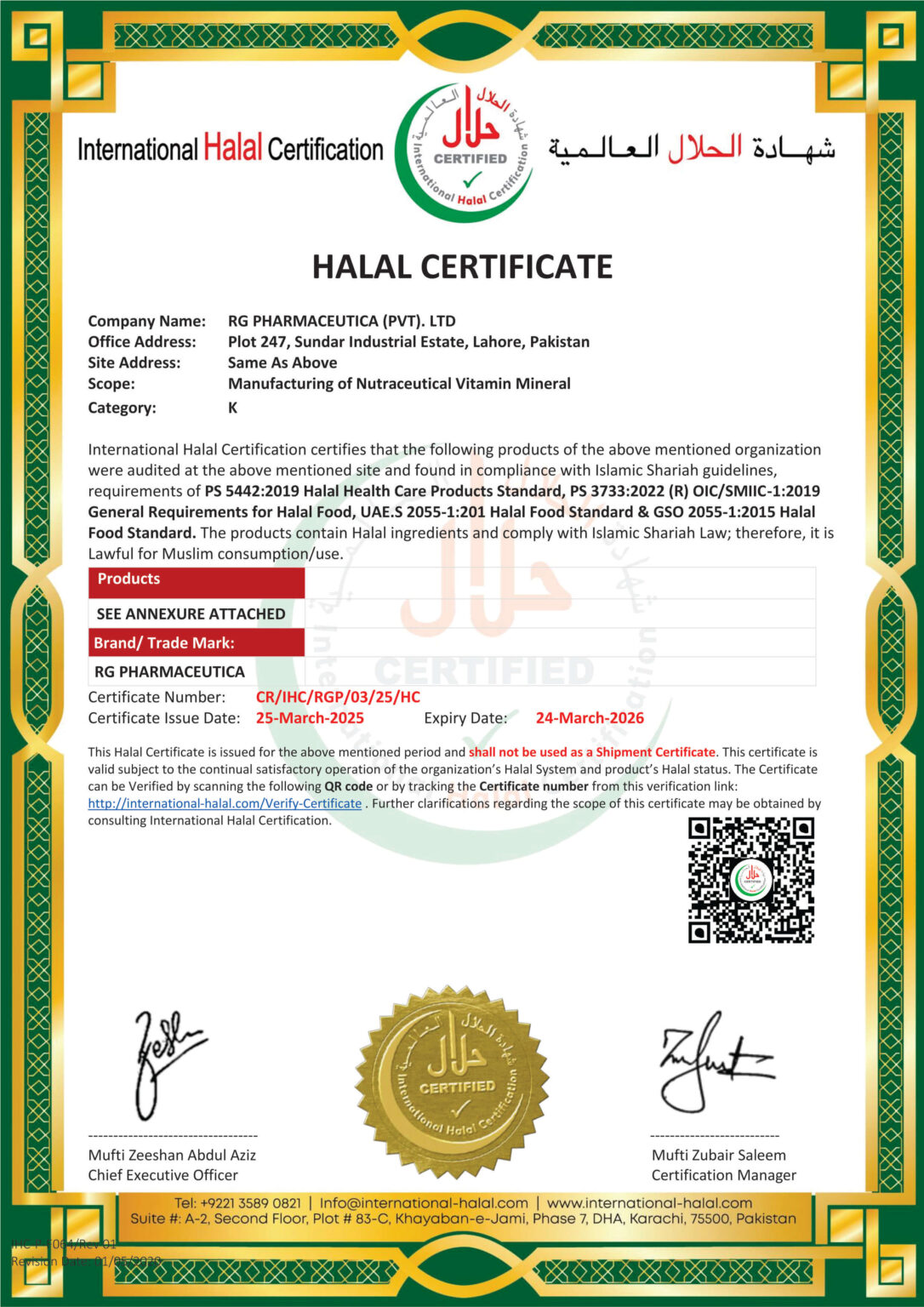 RG Pharmaceutica is committed to maintain Halal-ness of Nutritional Supplements, Nutraceutical, Health & OTC Products to fulfill the obligation for Muslims to consume Halal products as per Standards PS 5442;2019, PS 3733;2022, OIC/SMIIC-1:2019