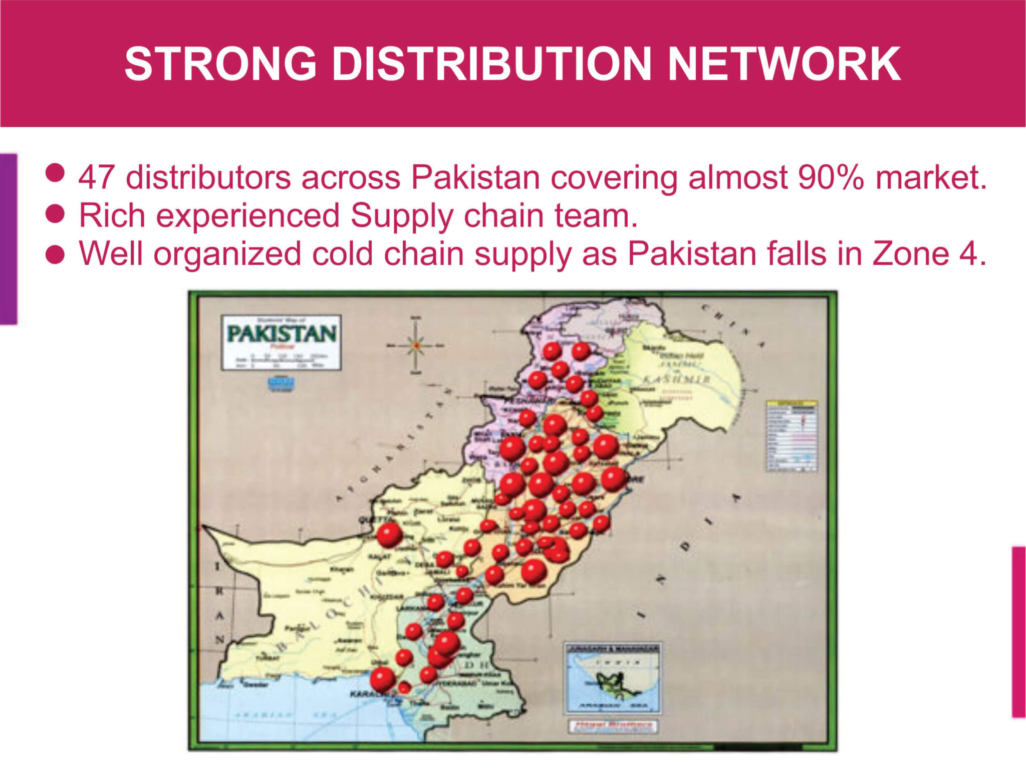 • 46 Sub-Distributors across country to cover retail pharmacies, Chain Pharmacies and Medical Stores complying with the rules & regulations of Drug Regulatory Authority of Pakistan in Practice.